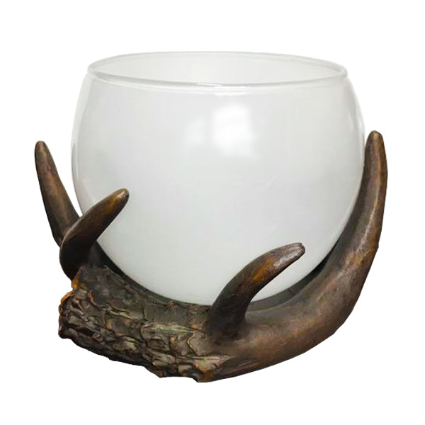This elegant two-piece candle holder features a faux antler base paired with a frosted glass holder, embodying a Western design aesthetic. Ideal for steakhouses, lodges, and cabin-style interiors, it adds a rustic yet sophisticated touch to any setting, enhancing the ambiance with its unique charm.
