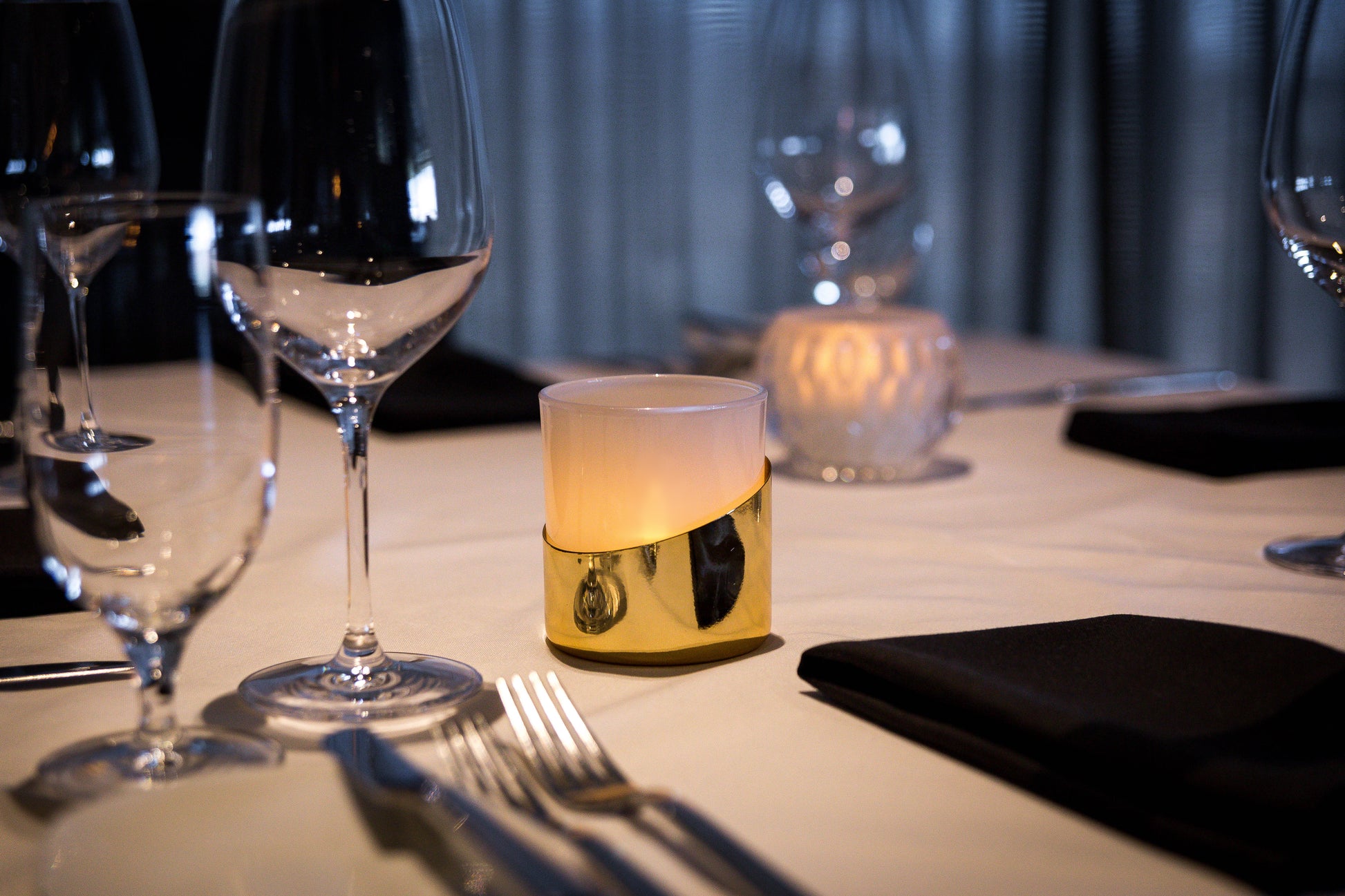 The exquisite gold-wrapped metal base, paired with a frosted glass inner holder, offers a stunning centerpiece that enhances fine dining experiences. This elegant design not only exudes sophistication but also creates an inviting ambiance, making it an ideal addition to any upscale setting. Elevate your dining atmosphere with this perfect blend of class and style.