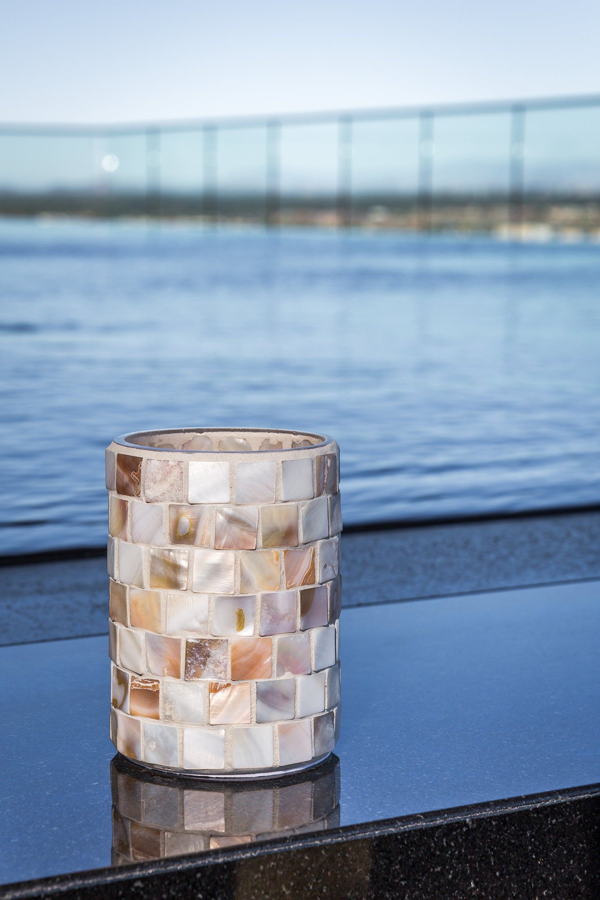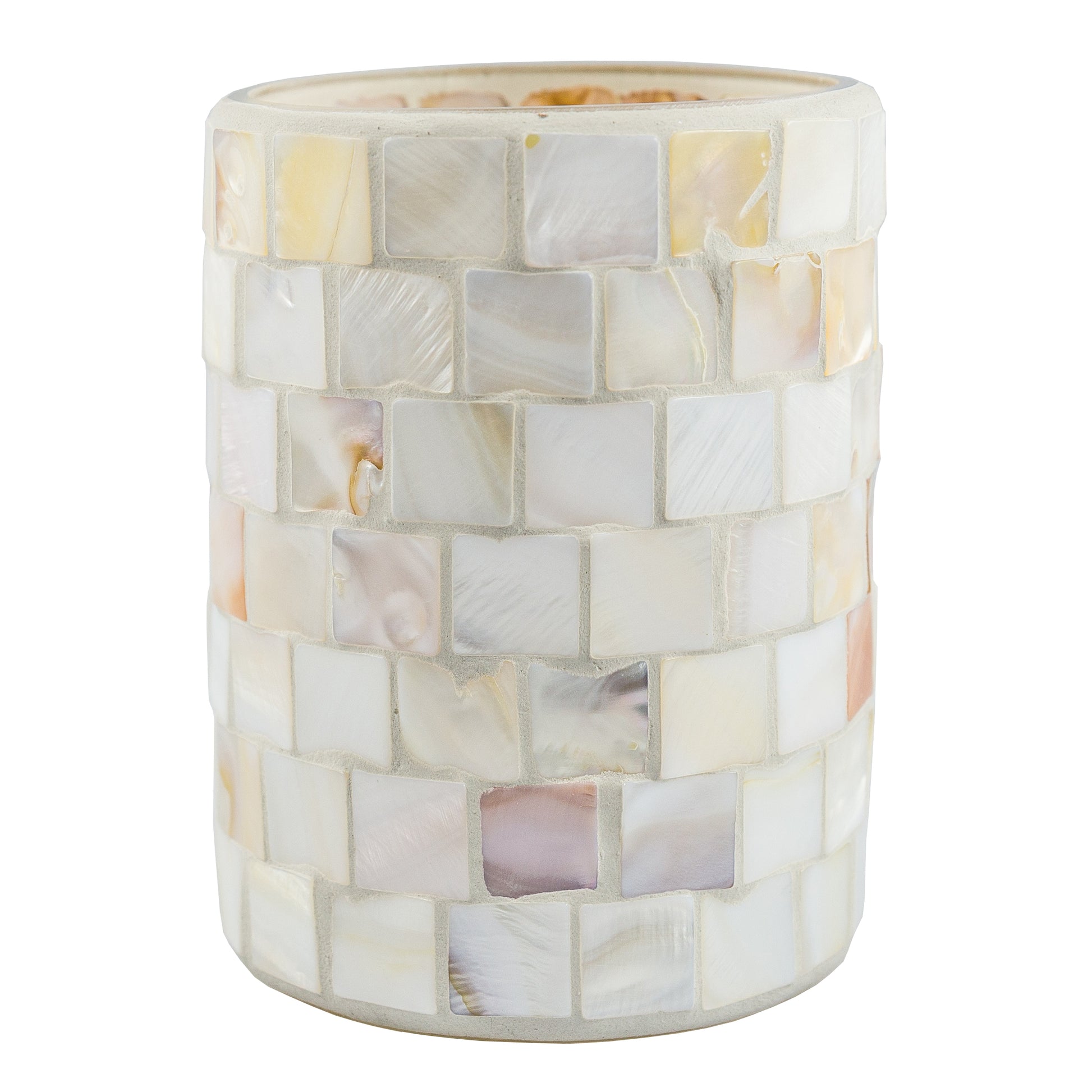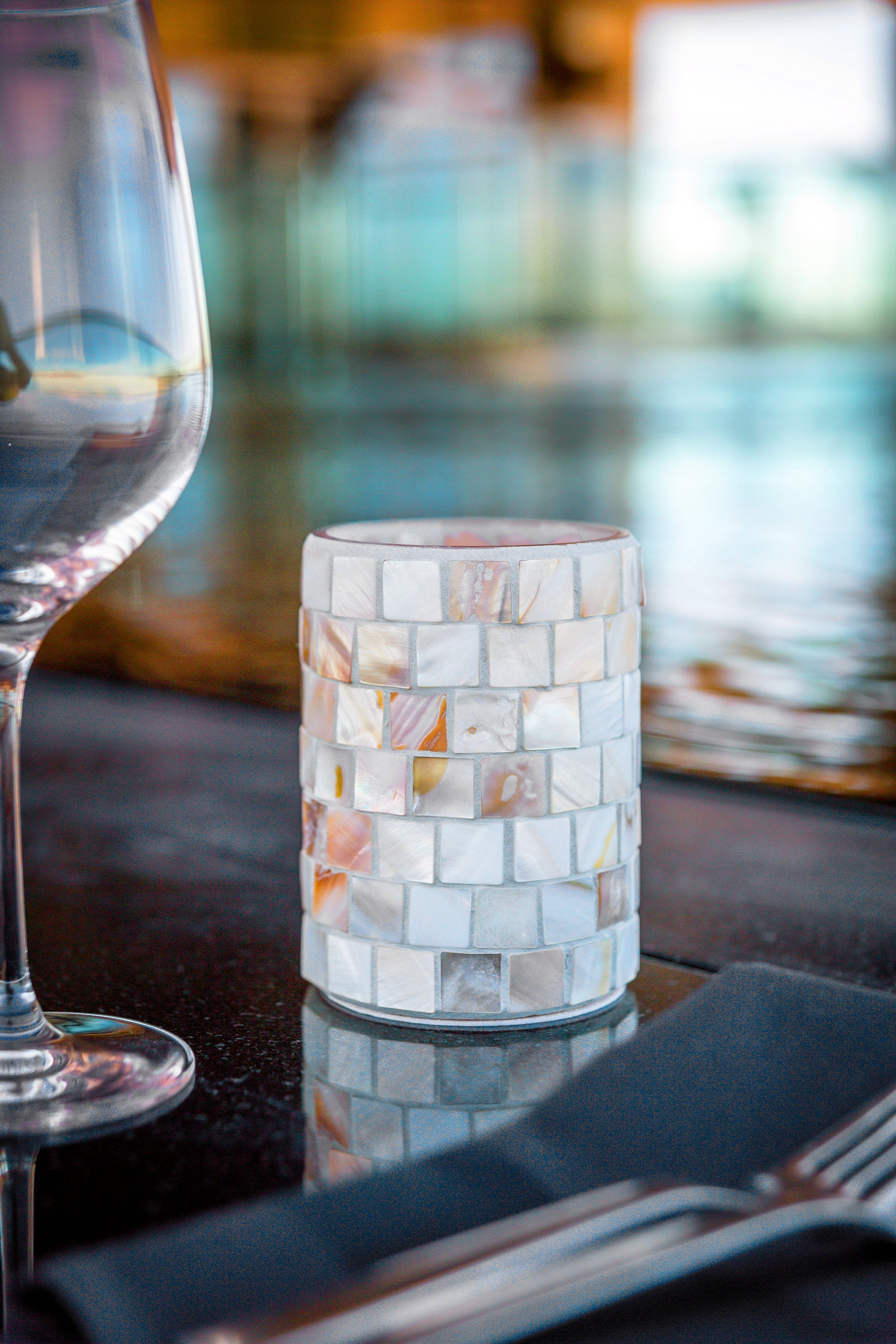 The intricate design incorporates hand-tiled mother of pearl glass, showcasing the natural beauty of pearl sea shells. Ideal for both indoor and outdoor dining spaces, this unique holder adds a touch of elegance and sophistication, making it a perfect centerpiece for any occasion.